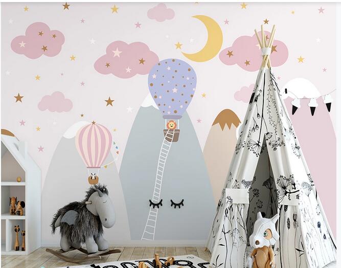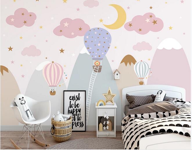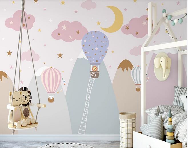 Cartoon Pink Hot-air Balloon Nursery Wallpaper, Lovely Animals Lion and Colorful Mountains Kids' Room Babies' Room Children' Room Wall Murals