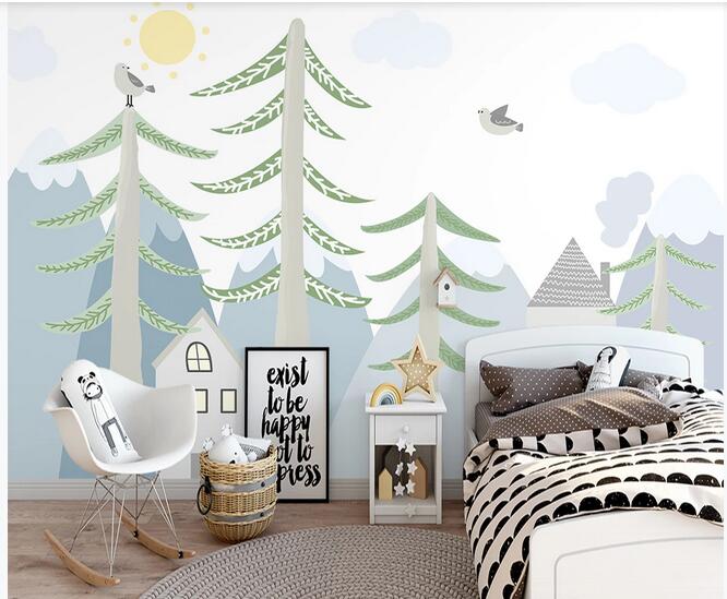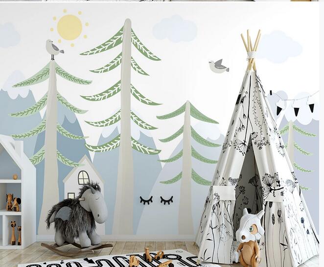 Cartoon Trees Forest and Mountains Nursery Wallpaper, Flying Birds Kids' Room Babies' Room Children' Room Wall Murals