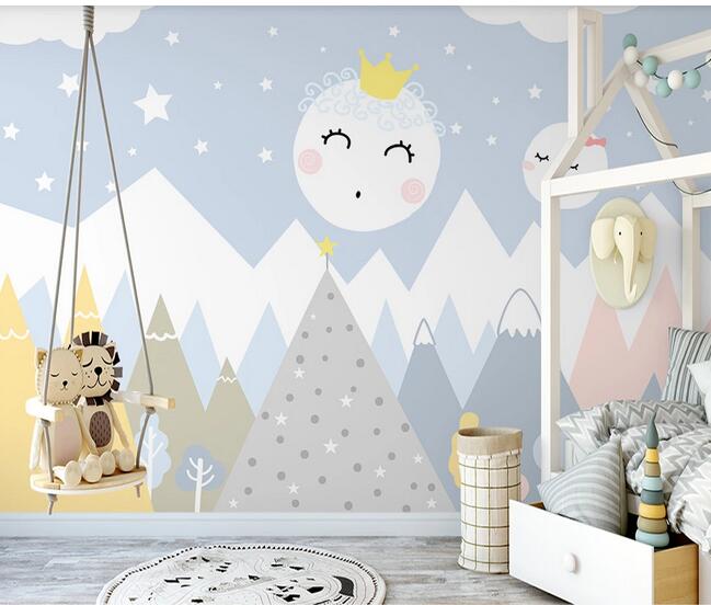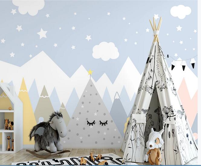 Cartoon White Coluds and Mountains Nursery Wallpaper, Triangle Mountains Kids' Room Babies' Room Children' Room Wall Murals