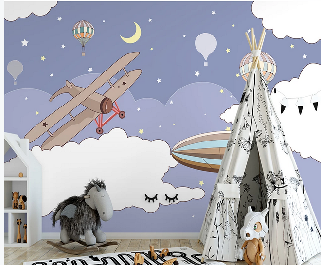 Cartoon Airplane Nursery Wallpaper, White Clouds and Stars Kids' Room Babies' Room Children' Room Wall Murals