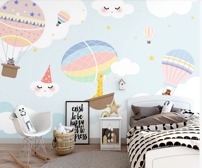 Cartoon Blue Sky and Clouds Nursery Wallpaper, Lovely Animals and Hot-air Balloon Kids' Room Babies' Room Children' Room Wall Murals