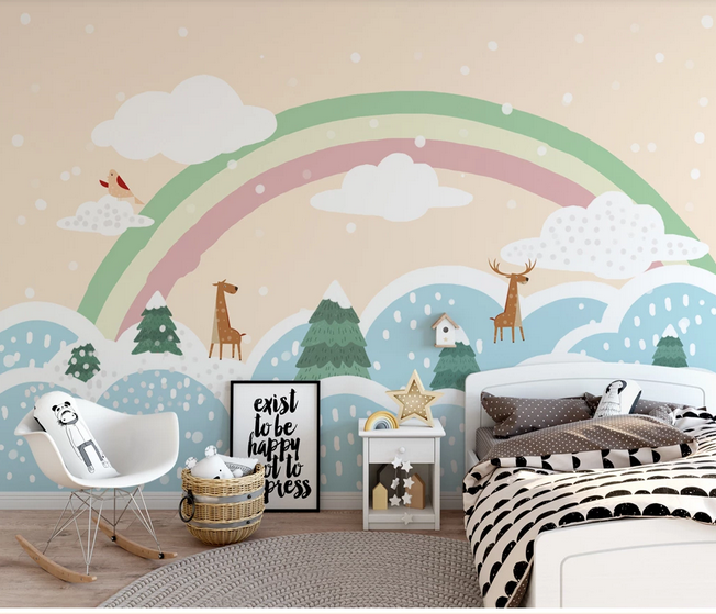 Cartoon Mountains and Trees Nursery Wallpaper, Beautiful Rainbow ad Lovely Deer Kids' Room Babies' Room Children' Room Wall Murals