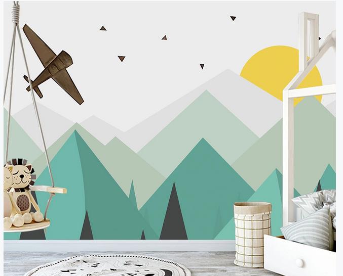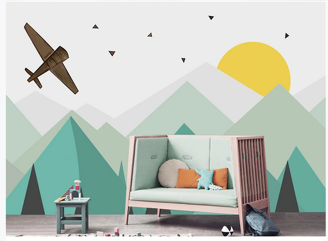 Cartoon Triangle Mountains Nursery Wallpaper, Sun and Airplane Kids' Room Babies' Room Children' Room Wall Murals