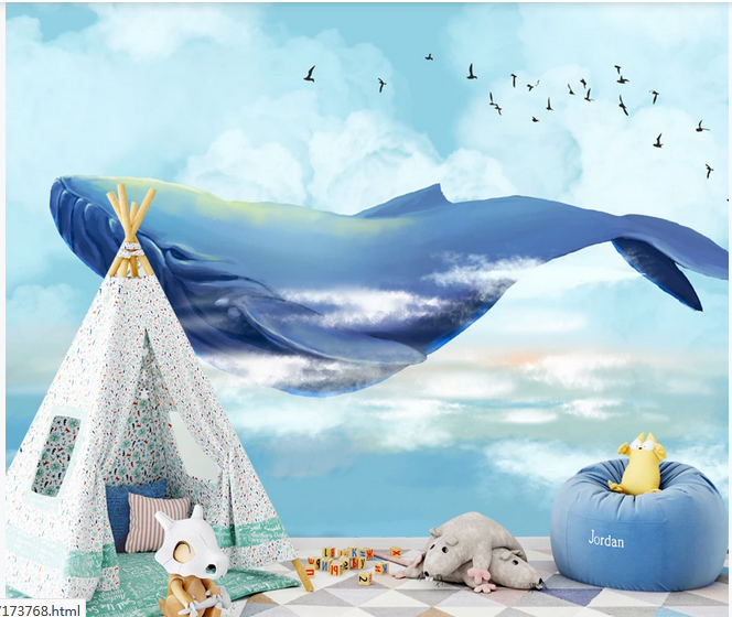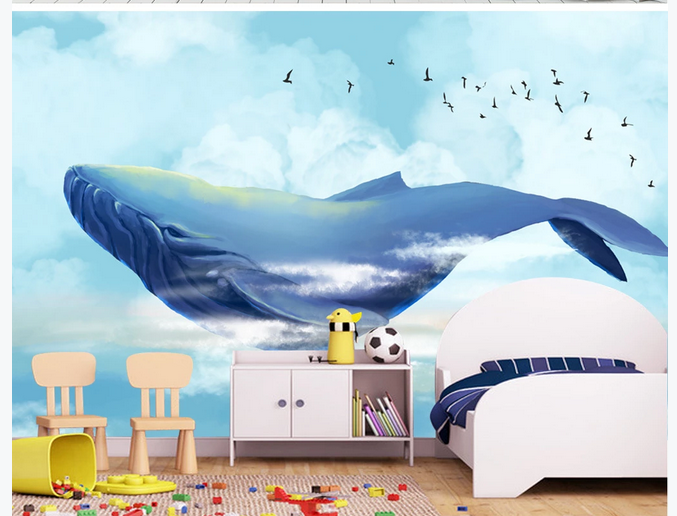 Big Shark Nursery Wallpaper, Flying Birds and Sky Blue Kids' Room Baby Girls' Room Children' Room Wall Murals