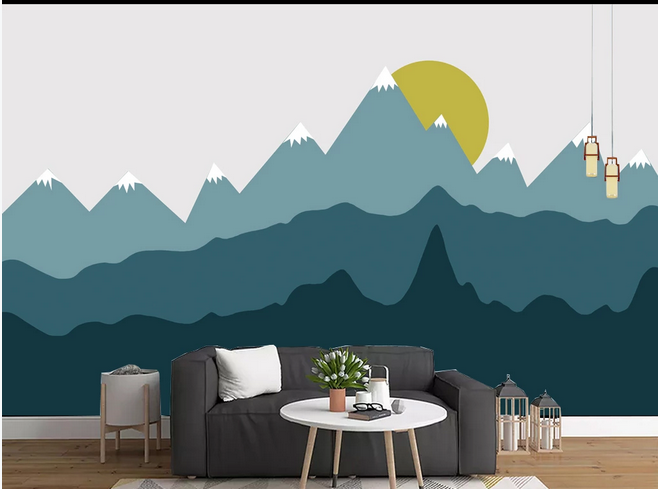 Cartoon Triangle Mountains Nursery Wallpaper, Yellow Sun and Mountains Kids' Room Babies' Room Children' Room Wall Murals