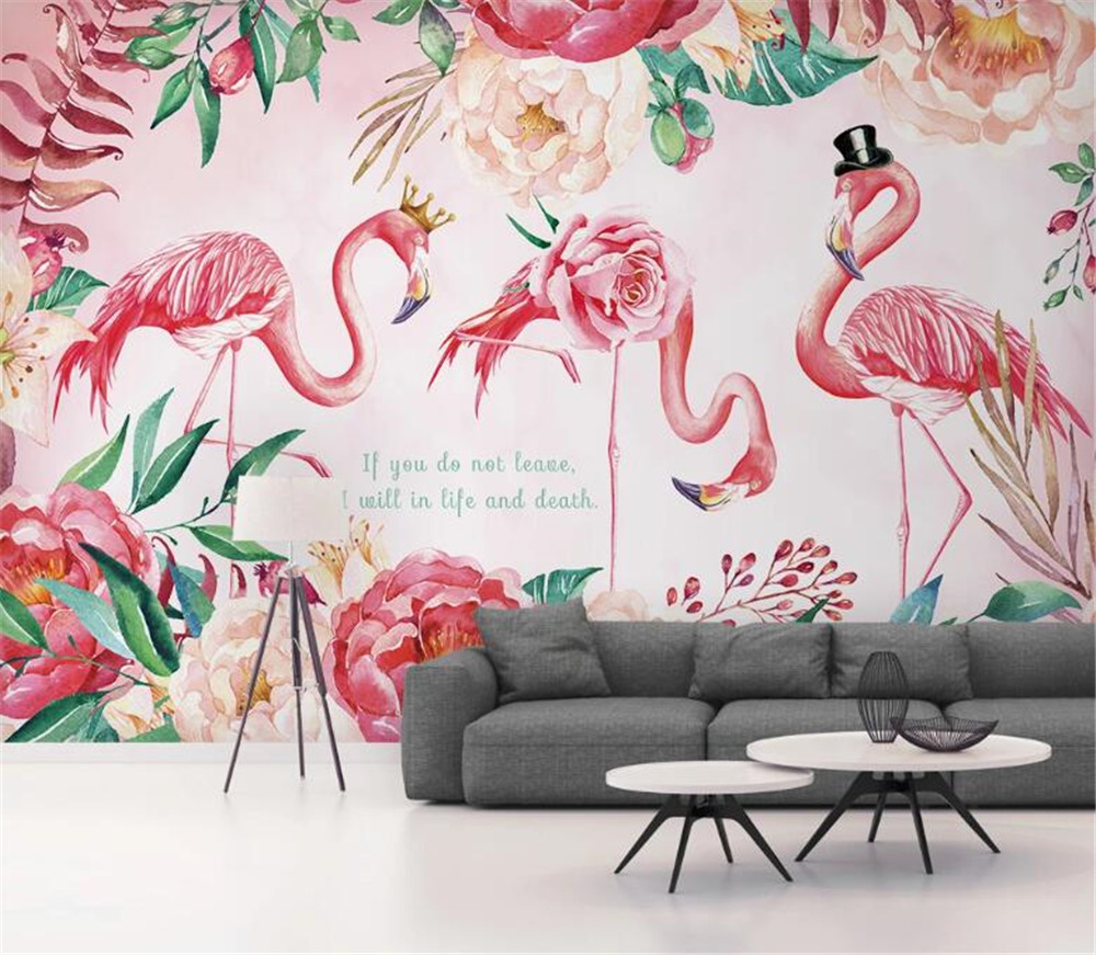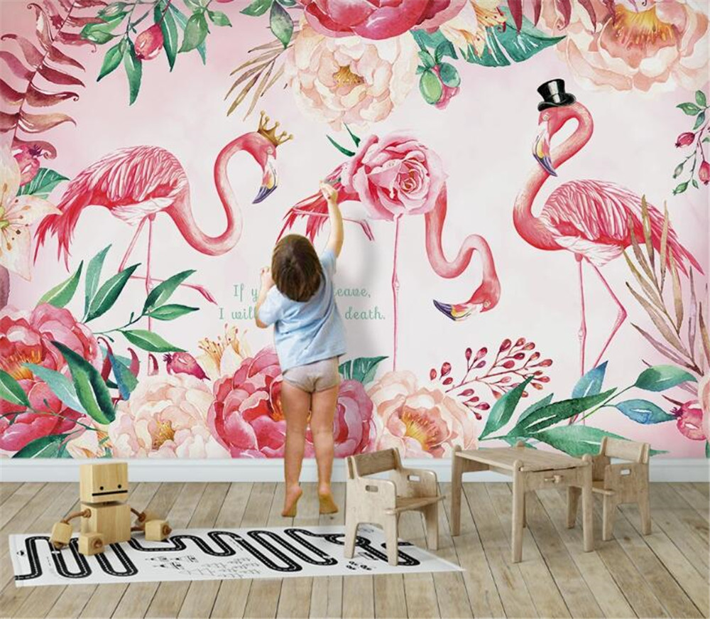 Custom Wallpaper Mural Nordic Flamingo Flower Plant Background Nursery Kids Room Wallpaper Mural