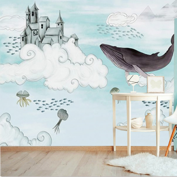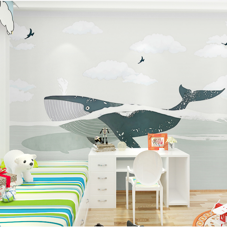 Cartoon boy children room bedroom wallpaper hand-painted whale background wall paper