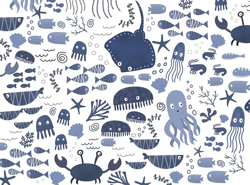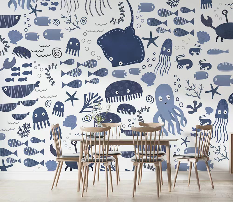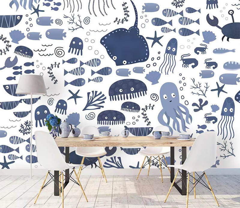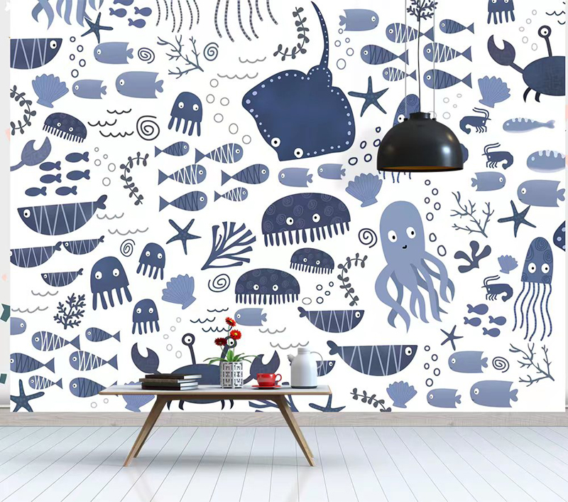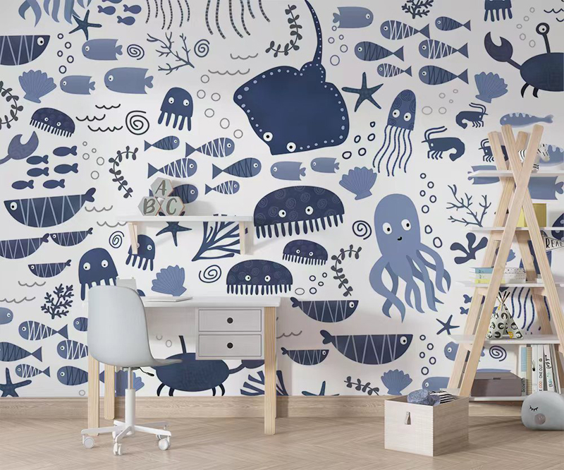 Custom Blue Cartoon Underwater Sea World Animals Nursery Mural Wallpaper for Kids Room Backdrop Children Wall Murals