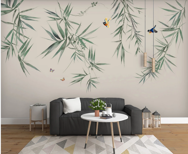 Chinese Brushwork Hanging Bamboo Wallpaper, Flying Birds Wall Murals for Living or Dinning Room