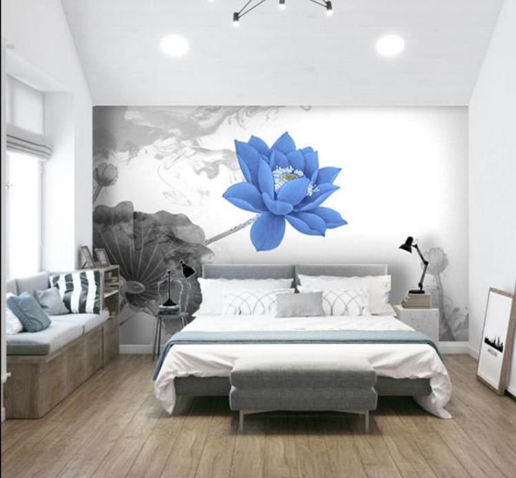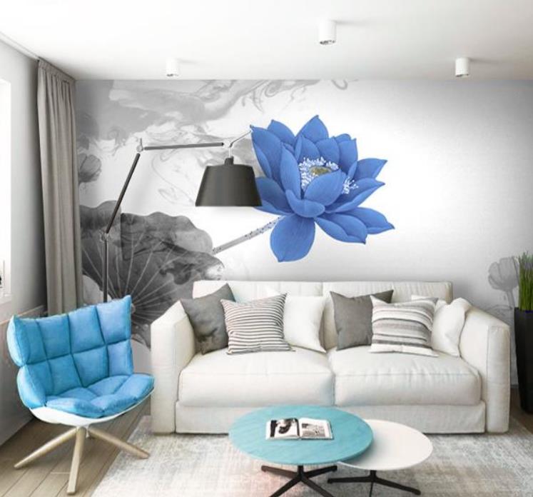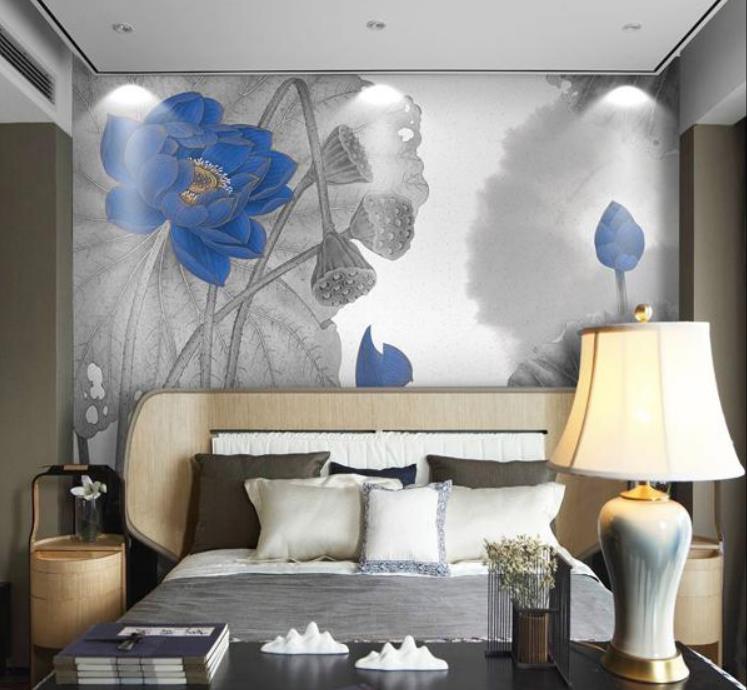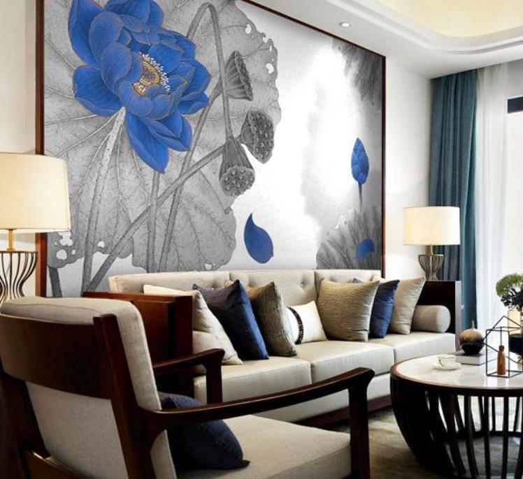 New Chinese style custom wallpaper hand-painted blue lotus background wall murals