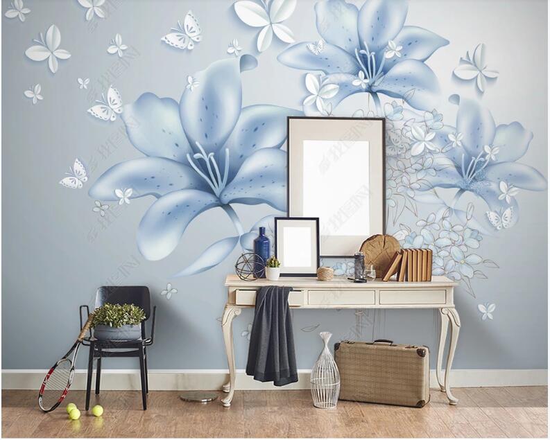 3D Blue Flowers Floral Wallpaper Wall Mural, 3D Giant Flowers with Butterflies Wall Mural Wall Decor