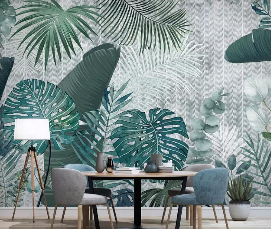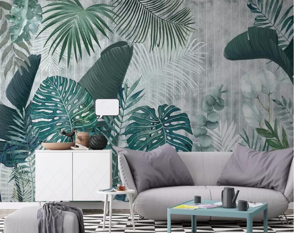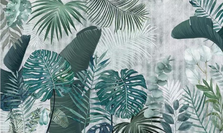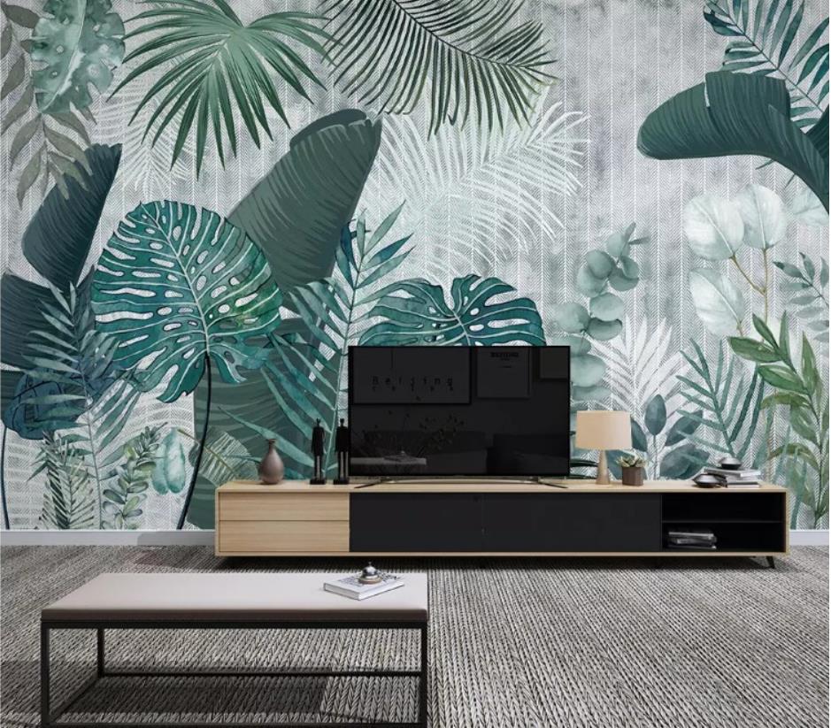 Hand-painted wallpaper rainforest plants contracted TV setting wall paper green leaves of mural