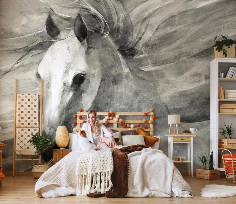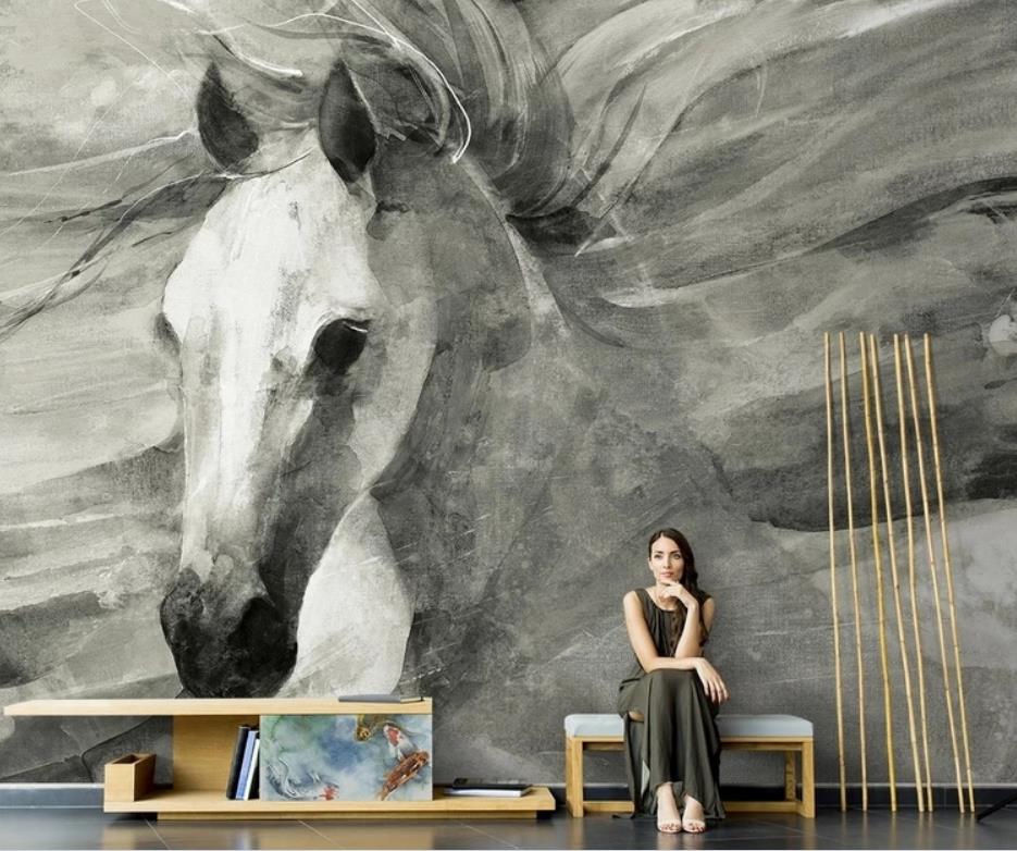 Nordic hand-painted abstract black and white horse horse paper sitting room TV setting wall murals