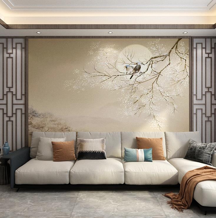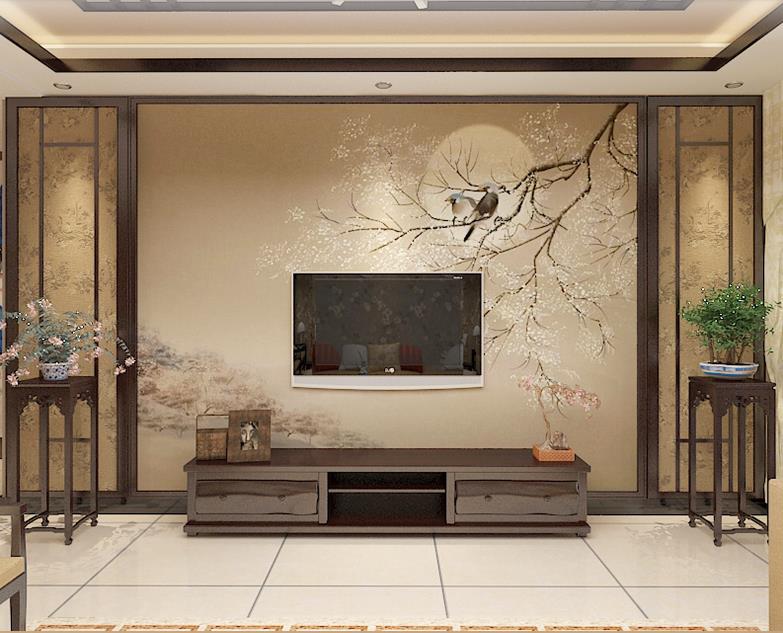 New Chinese style painting flowers and birds and flowers sitting room TV setting wall paper