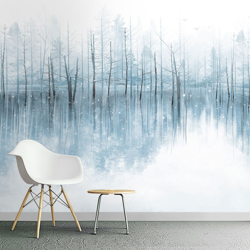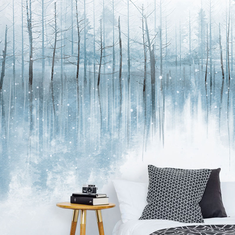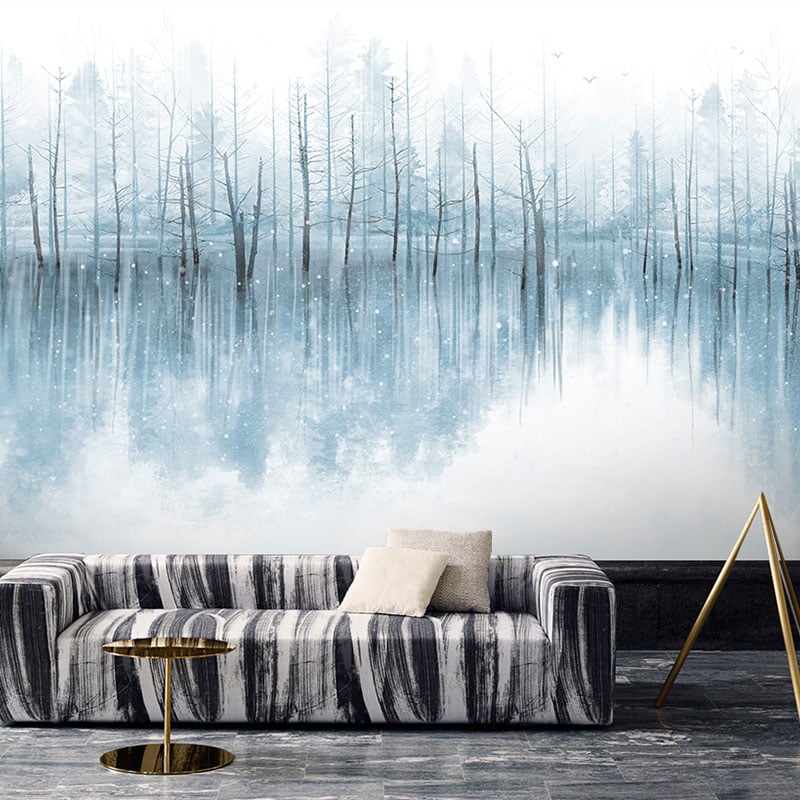 Cold tonal hand-painted ink landscape forest wallpaper murals