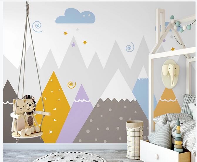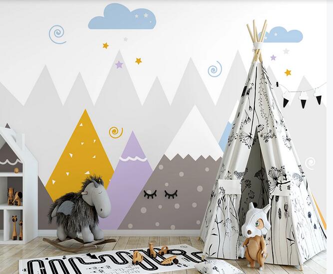 Cartoon Mountains Nursery Wallpaper, Lovely Stars and Clouds Kids' Room Babies' Room Children' Room Wall Murals