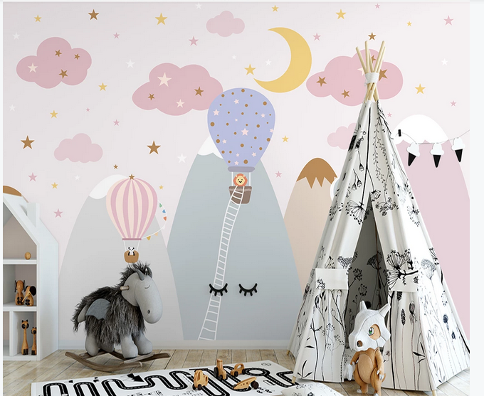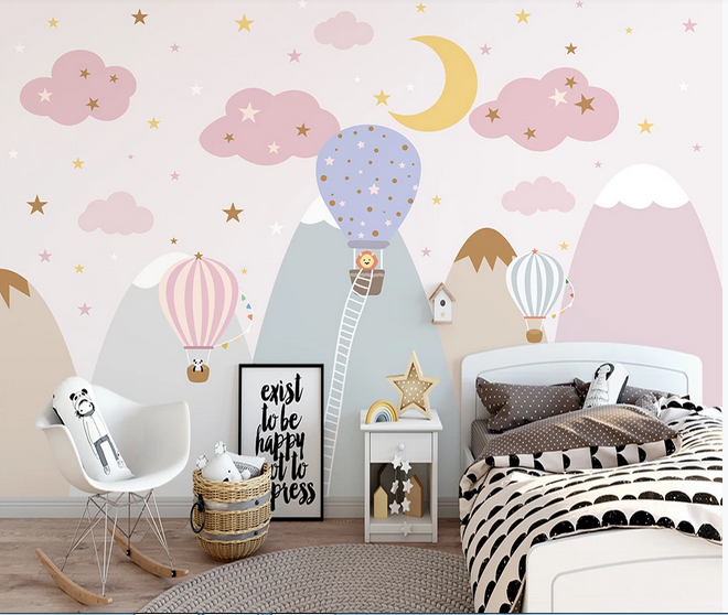 Cartoon Pink Clouds and Stars Nursery Wallpaper, Hot-air Balloon and Lovely Animals Kids' Room Babies' Room Children' Room Wall Murals