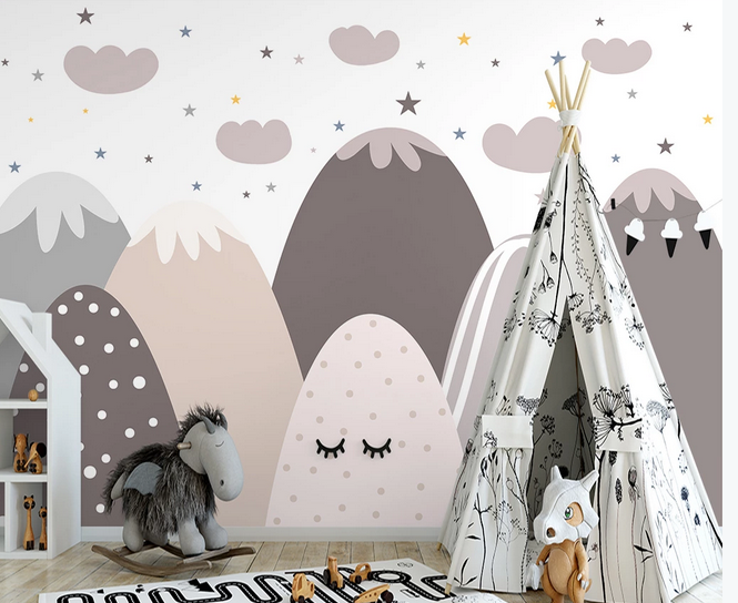 Cartoon Mountains Nursery Wallpaper, Simple Coluds and Stars Kids' Room Babies' Room Children' Room Wall Murals