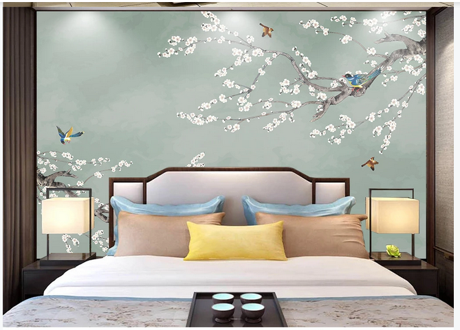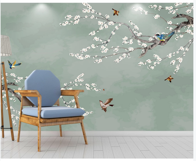 Chinese Brushwork Hanging Plum Wallpaper, Vivid Birds and Flowers Wall Murals