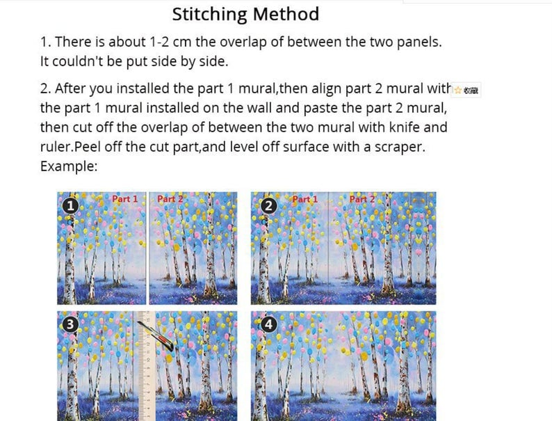 After you install the part 1 mural, then align the part 2 mural with the part 1 mural installed on the wall and paste the part 2 mural, then cut off the overlap of the two panels with knife and mural. Peel off the cut part and level off surface with a scraper.