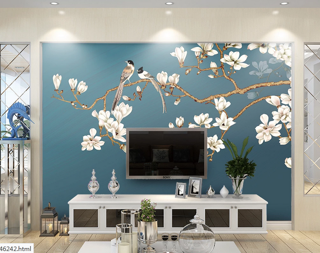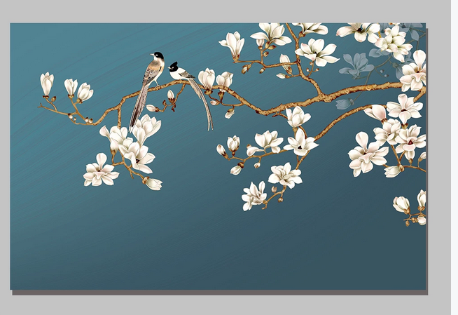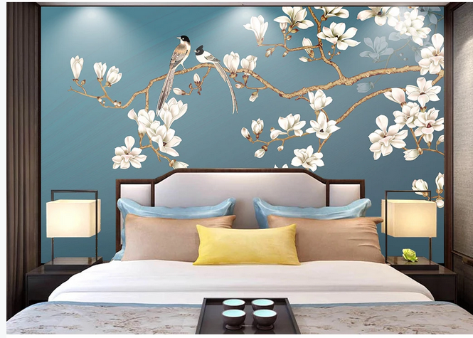 Chinese Brushwork Hanging Magnolia Wallpaper, Vivid Birds and Magnolia Flowers Wall Murals