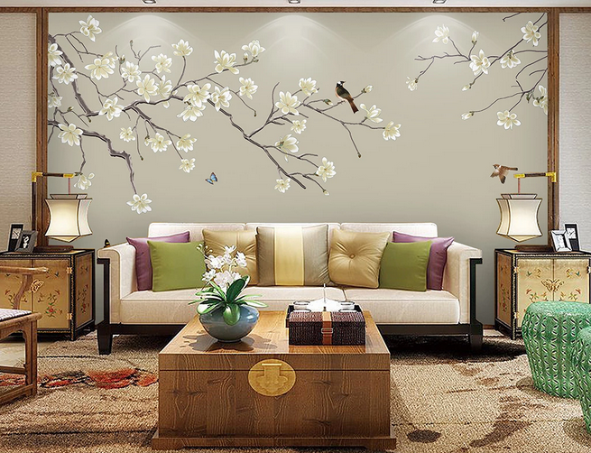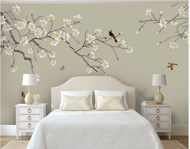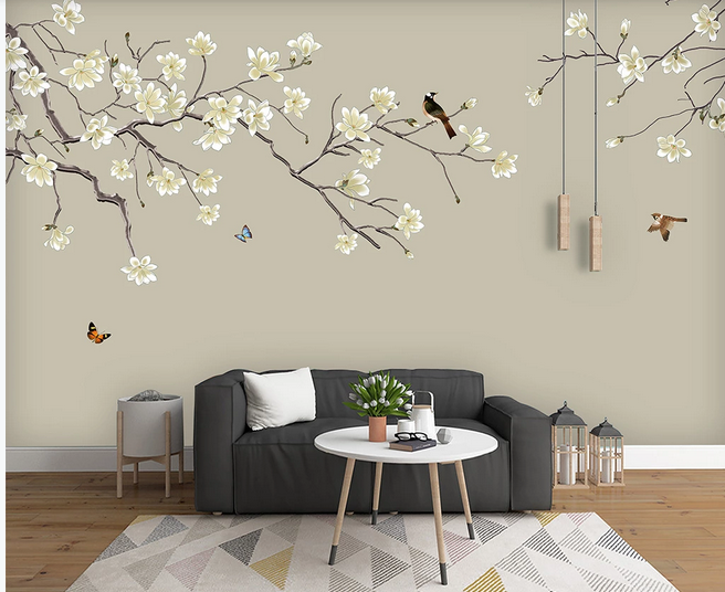 Chinese Brushwork Hanging Magnolia Wallpaper, Flying Birds and Butterfly Wall Murals for Living or Dinning Room
