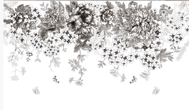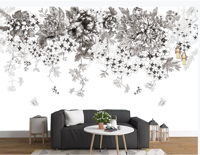 Sketch Flowers Wallpaper, Black and White Hanging Flowers Wall Murals for Living or Dinning Room