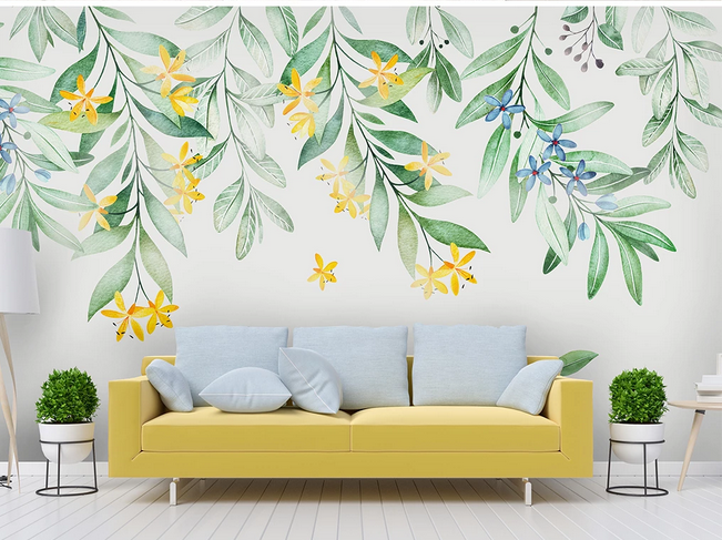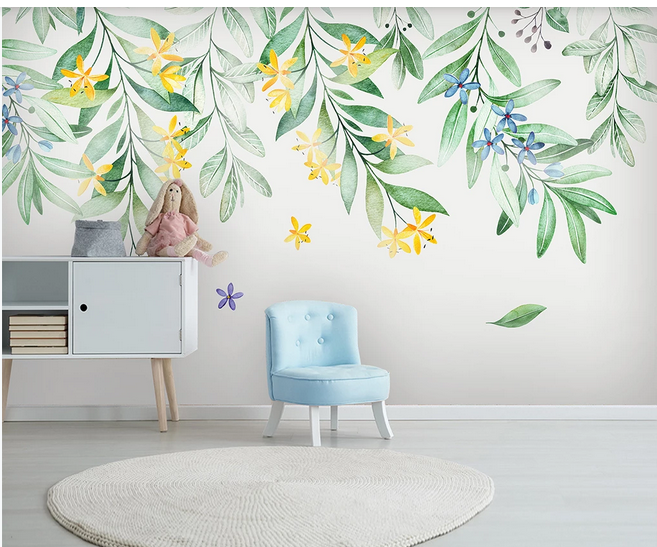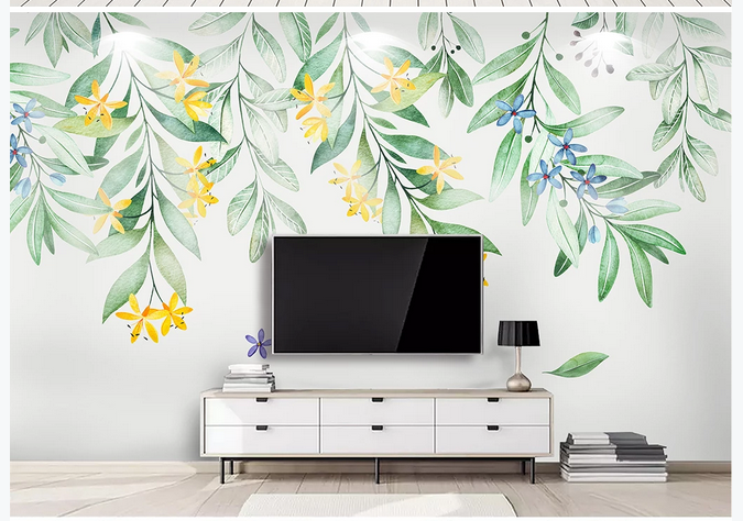 Watercolor Simple Leaf Wallpaper, Small Flowers and Leaves Wall Murals for Living or Dinning Room