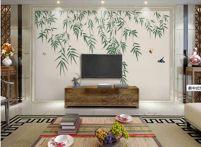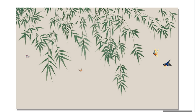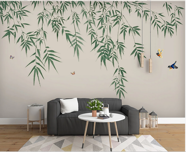 Chinese Brushwork Hanging Bamboo Wallpaper, Flying Birds Wall Murals for Living or Dinning Room