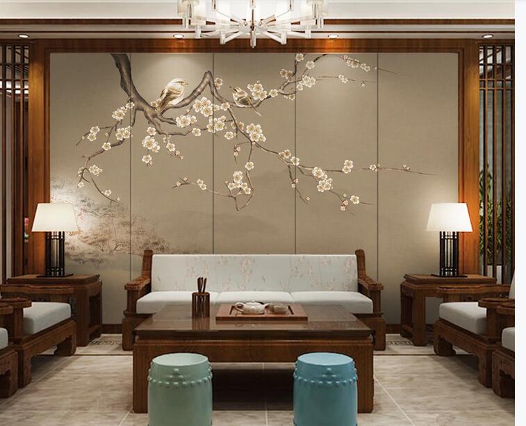 Chinese Brushwork Hanging Plum Tree Wallpaper, Vivid Birds Wall Murals for Living or Dinning Room