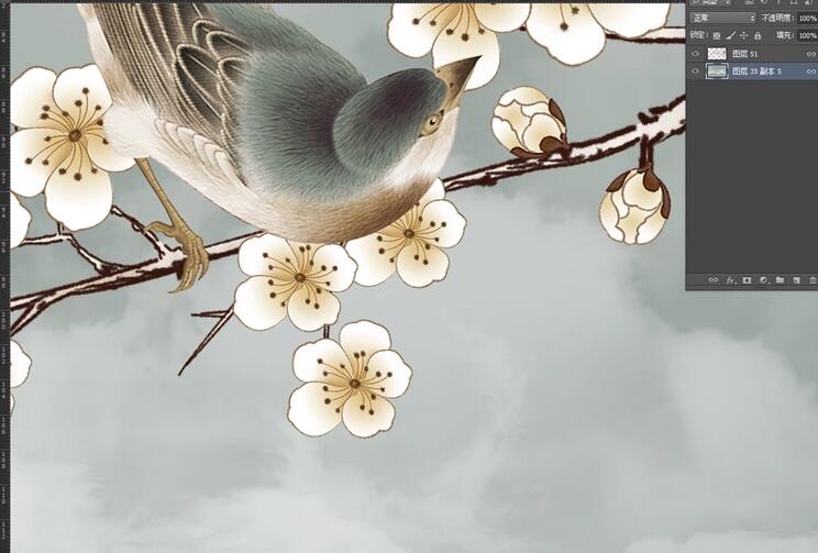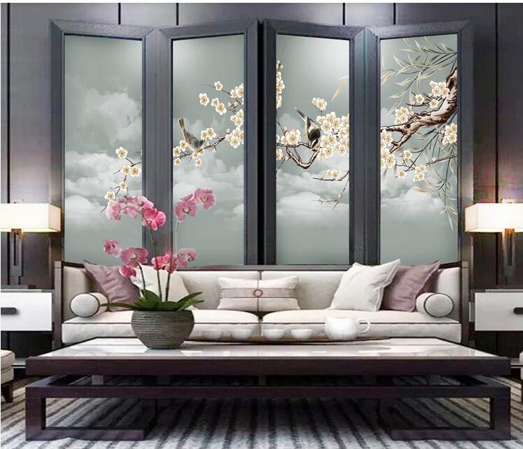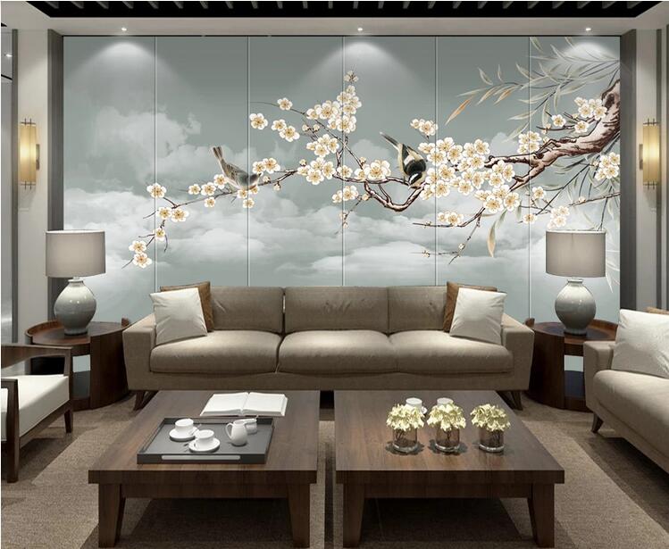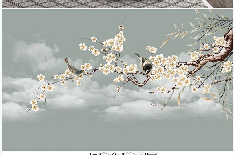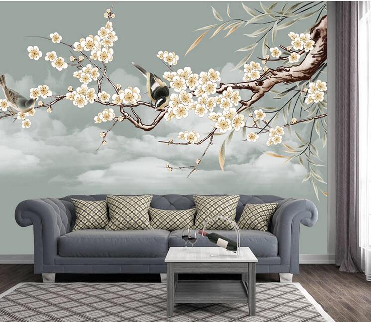 Chinese Brushwork Hanging Plum Tree Wallpaper, Vivid Birds Wall Murals for Living or Dinning Room