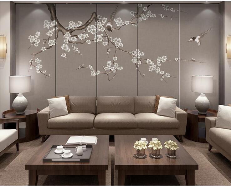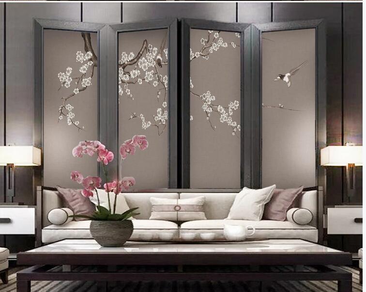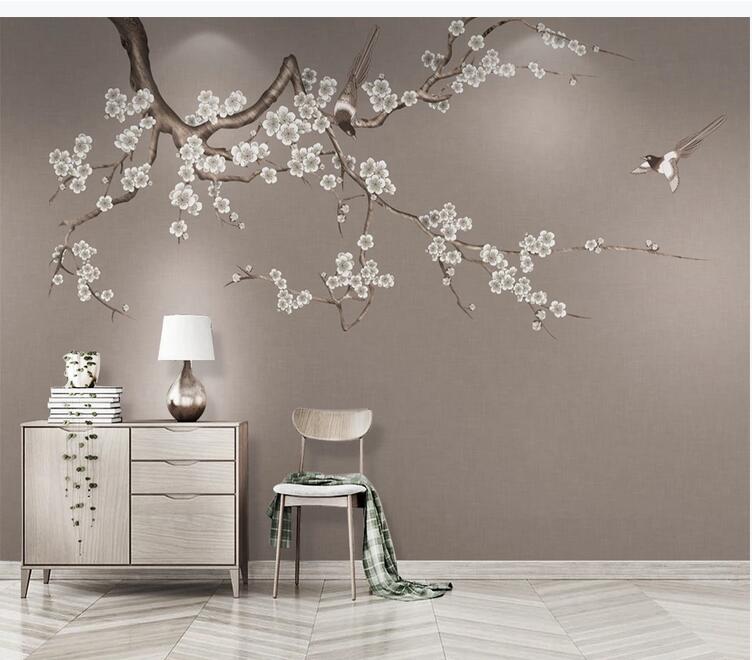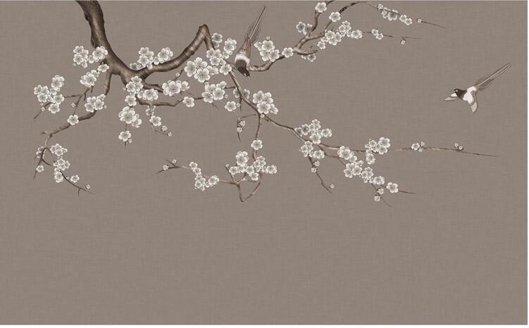 Chinese Brushwork Hanging Plum Tree Wallpaper, Vidvid Birds Wall Murals for Living or Dinning Room