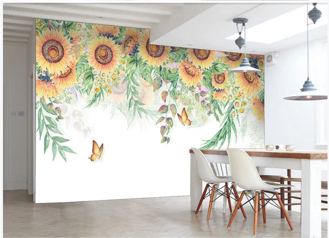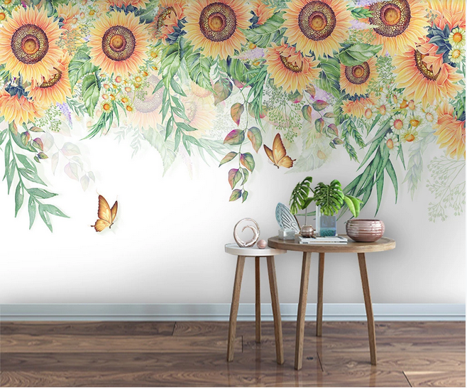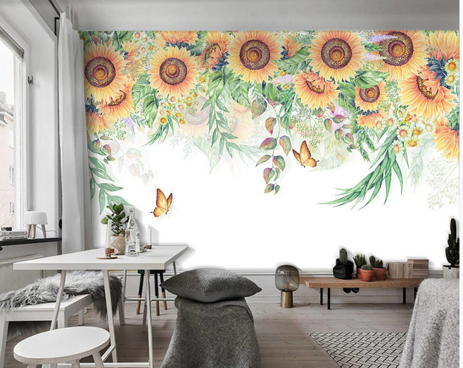 Hanging Sunflowers Wallpaper, Flying Butterflies and Sunflowers Wall Murals for Living or Dinning Room