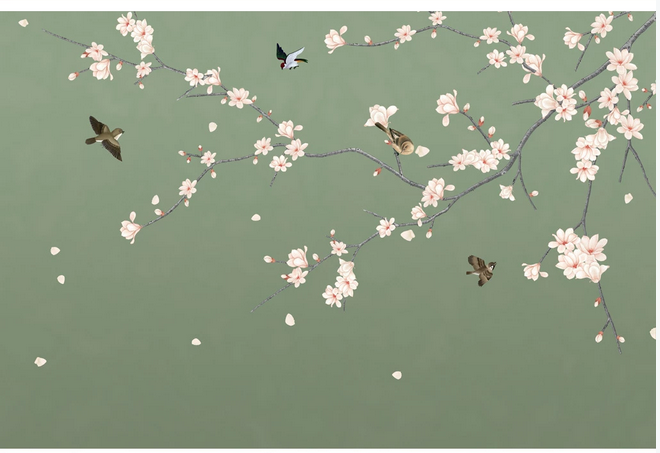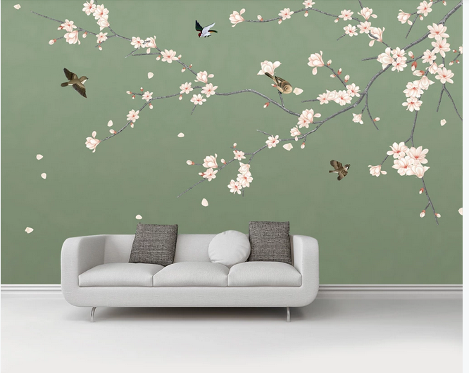 Chinese Brushwork Hanging Magnolia Wallpaper, Vivid Birds Wall Murals for Living or Dinning Room