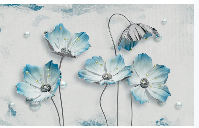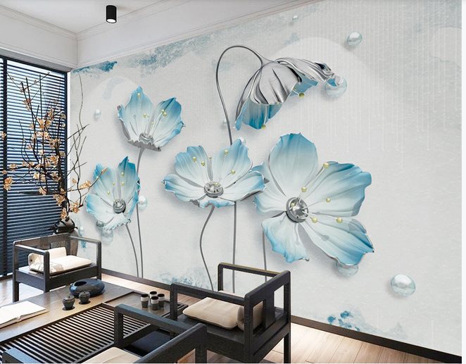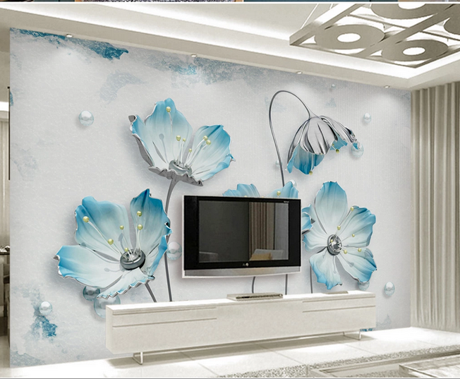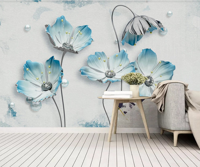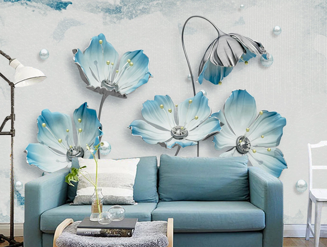 3D Blue Flowers Wallpaper, Big Blue Flowers Wall Murals for Living or Dinning Room