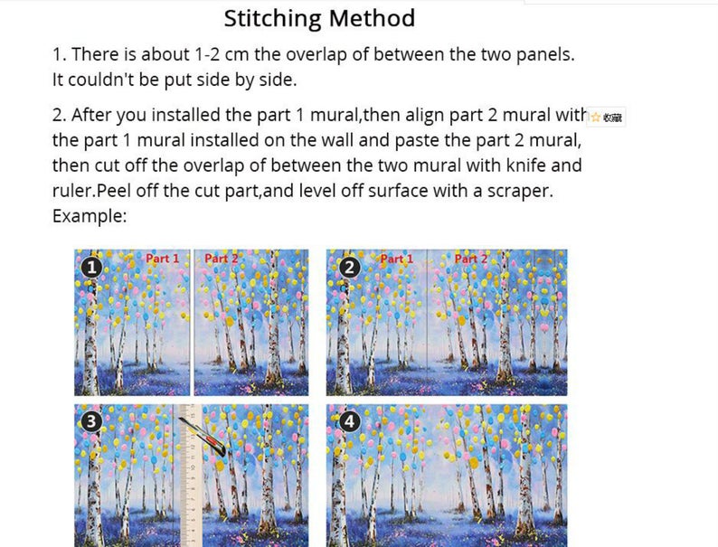 After you install the part 1 mural, then align the part 2 mural with the part 1 mural installed on the wall and paste the part 2 mural, then cut off the overlap of the two panels with knife and mural. Peel off the cut part and level off surface with a scraper.