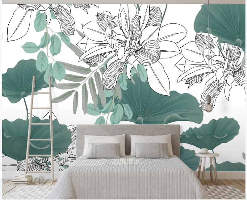Green Tropical Plants Leaves with Flowers Wallpaper Wall Mural, Unique Vintage Color Tropical Leaves Plants Wall Mural Wall Decor