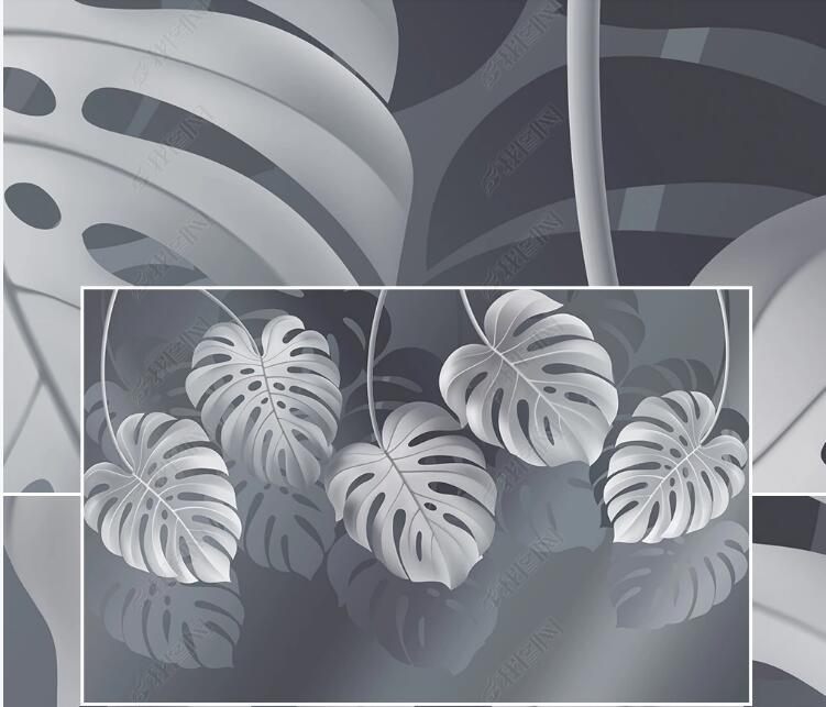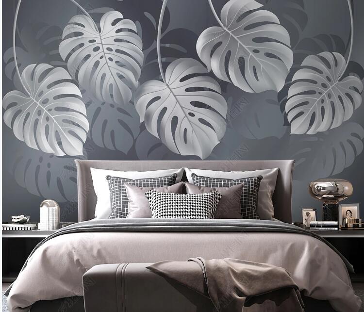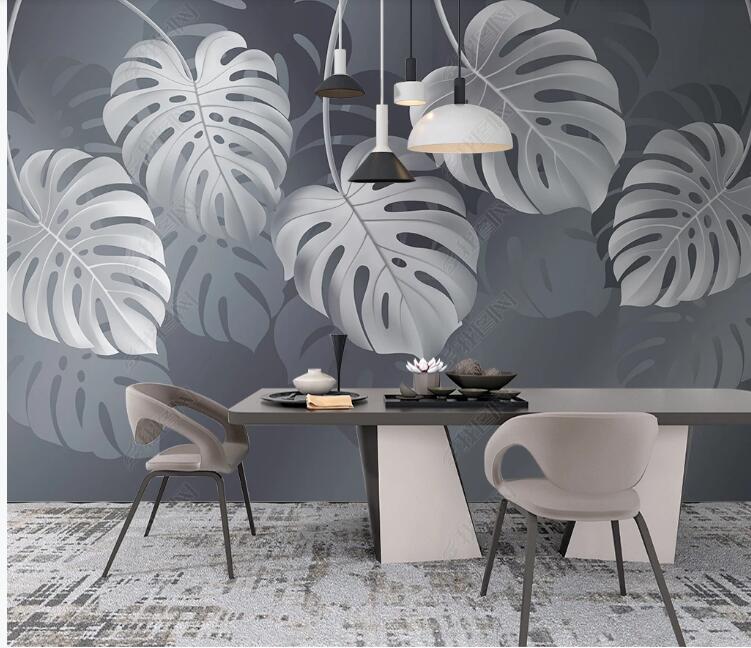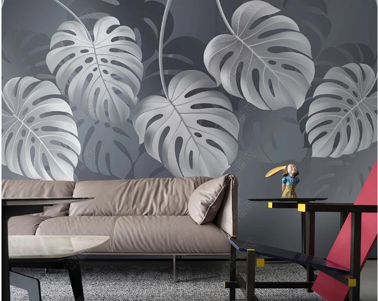 Grey Background Hanging Tropical Leaves Wallpaper Wall Mural, Grey Tropical Leaves Wall Mural Wall Decor