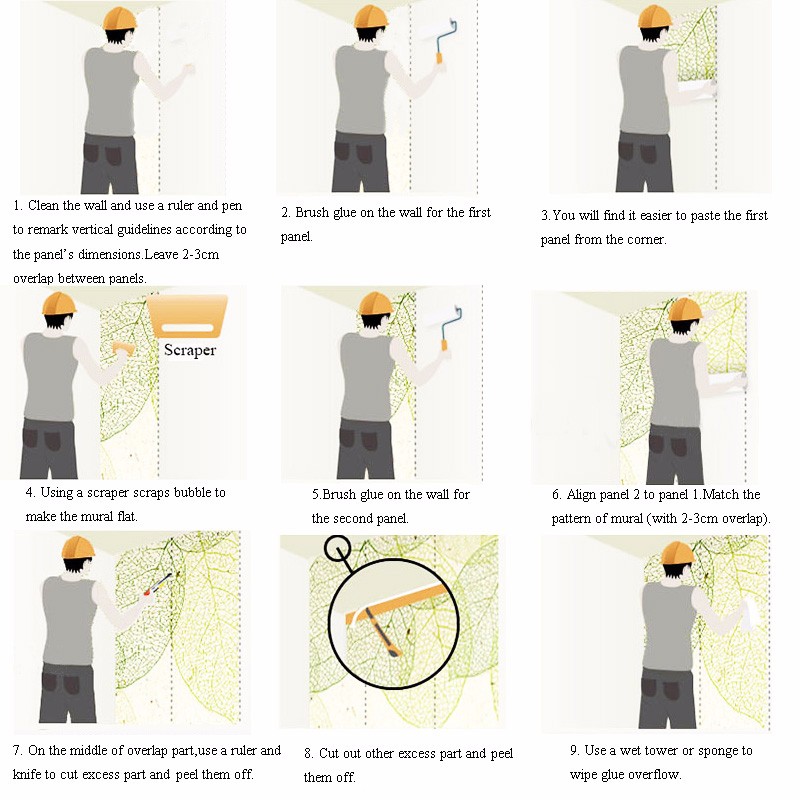 After you install the part 1 mural, then align the part 2 mural with the part 1 mural installed on the wall and paste the part 2 mural, then cut off the overlap of the two panels with knife and mural. Peel off the cut part and level off surface with a scraper.
