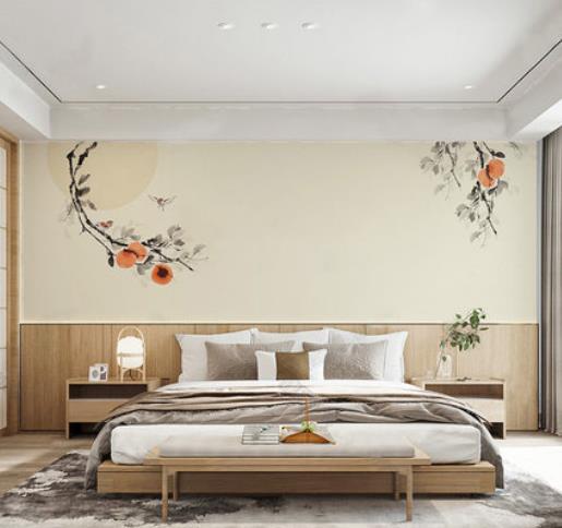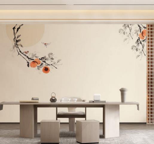 Chinese style is simple but elegant artistic conception ink full moon persimmon sofa bedroom wallpaper murals
