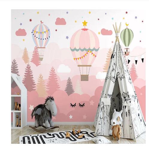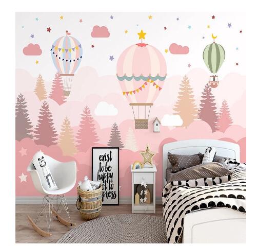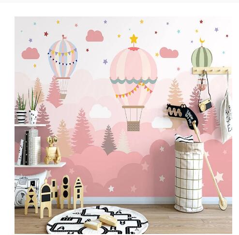 Pink Cartoon Clouds Hot Air Balloon Children Room Girl Bedroom Mural Wallpaper