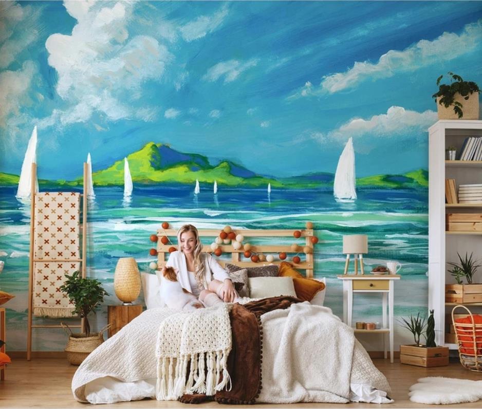 Nordic abstract oil painting scenery seascape sailing only beautiful living room TV setting sofa wallpaper murals