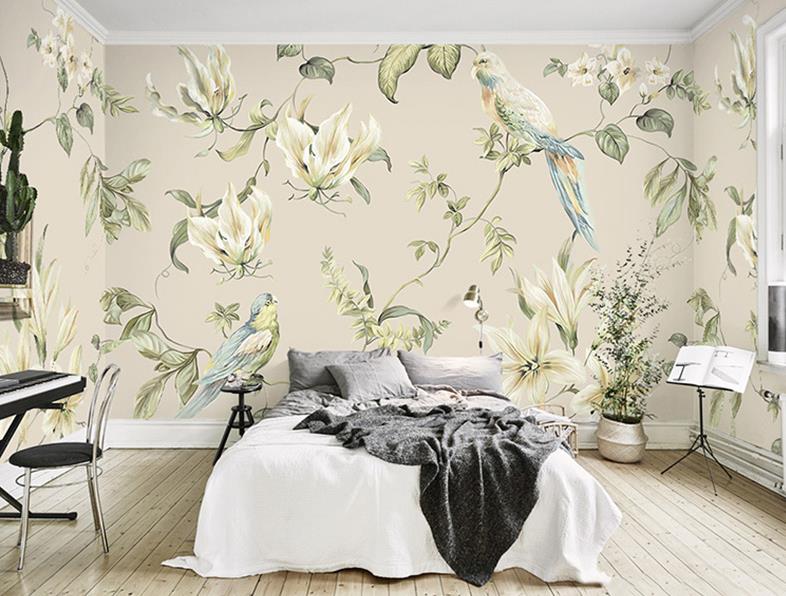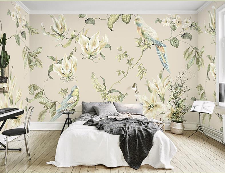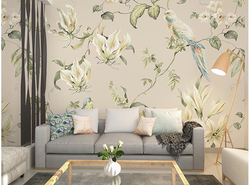 Hand-painted pastoral paintings of flowers and birds wallpaper murals