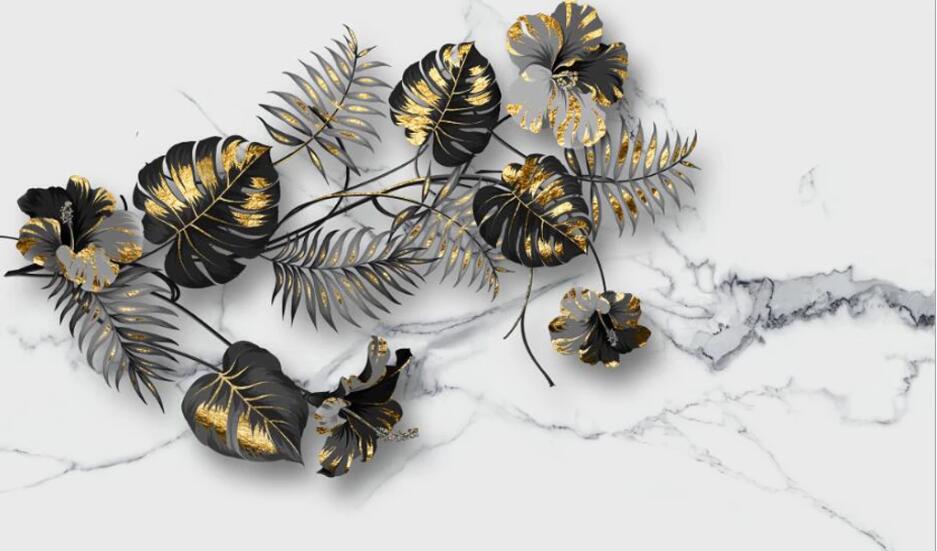 Tropical Plant and Gold Leaf Marble Wallpaper Wall Murals