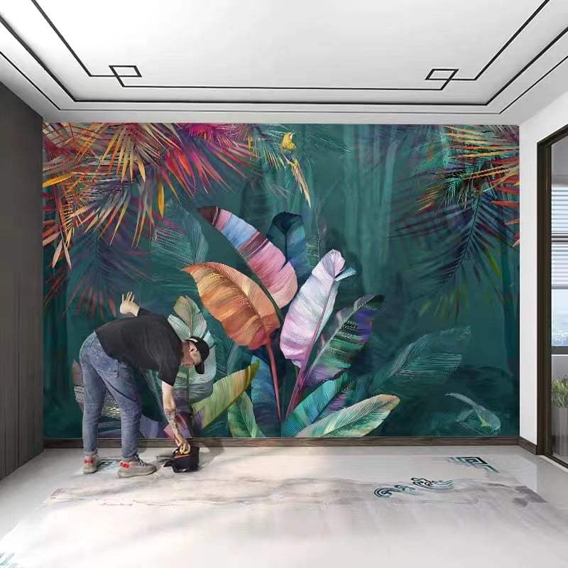 4.Brush glue on wall or back of wallpaper and align the first mural to the chalk line and paste it.(Note: please leave 1-2cm for the top and bottom of the panel)