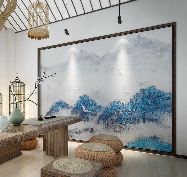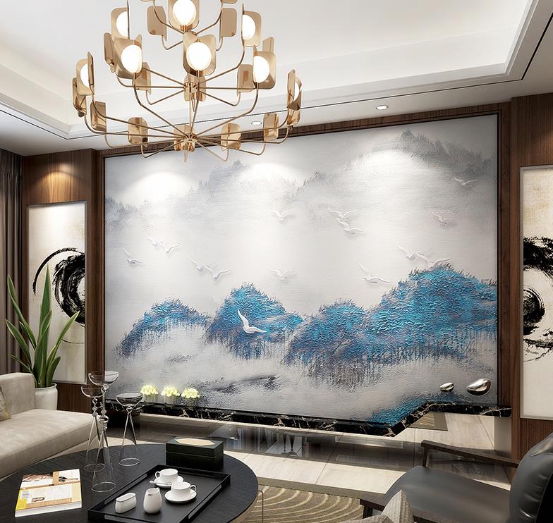 New Chinese style hand-painted mountains forest birds wallpaper murals