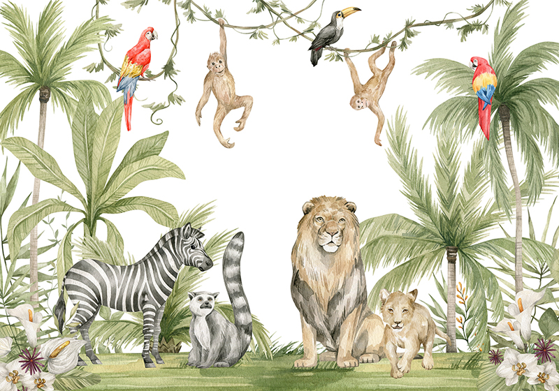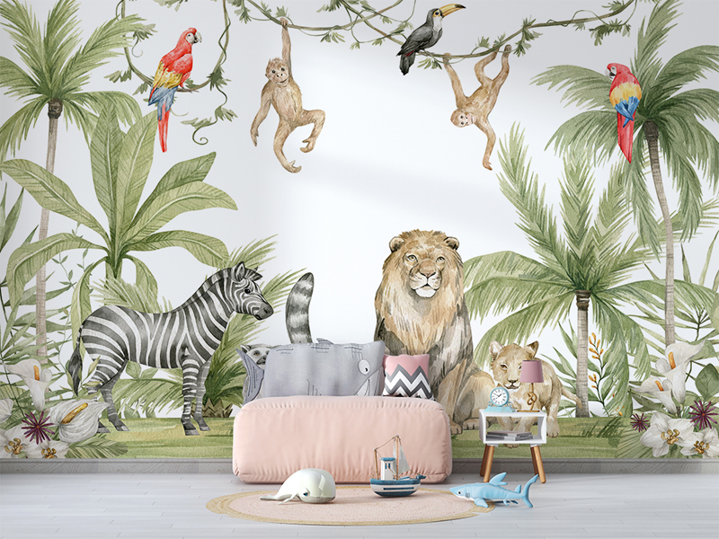 Large Watercolor Tropical Plant Palm Tree Safari African Amimal Cartoon Nursery Wallpaper Jungle Mural for Kids Children Room