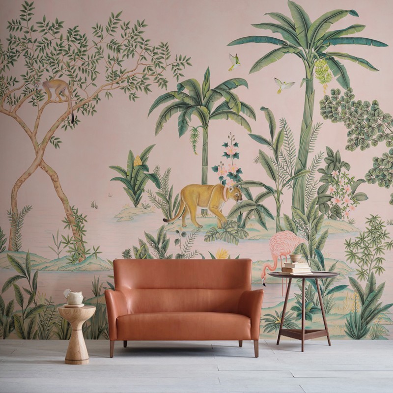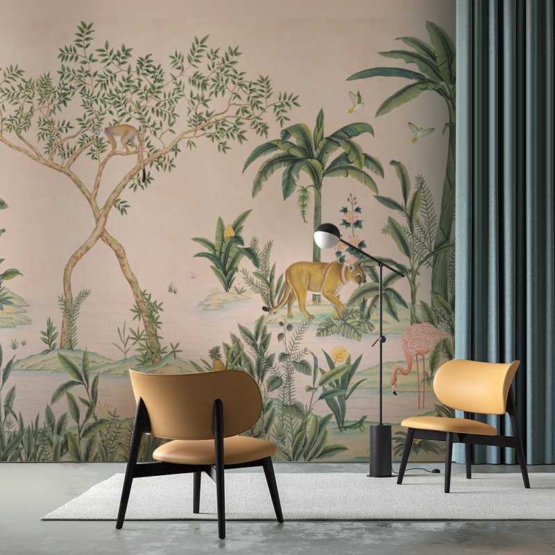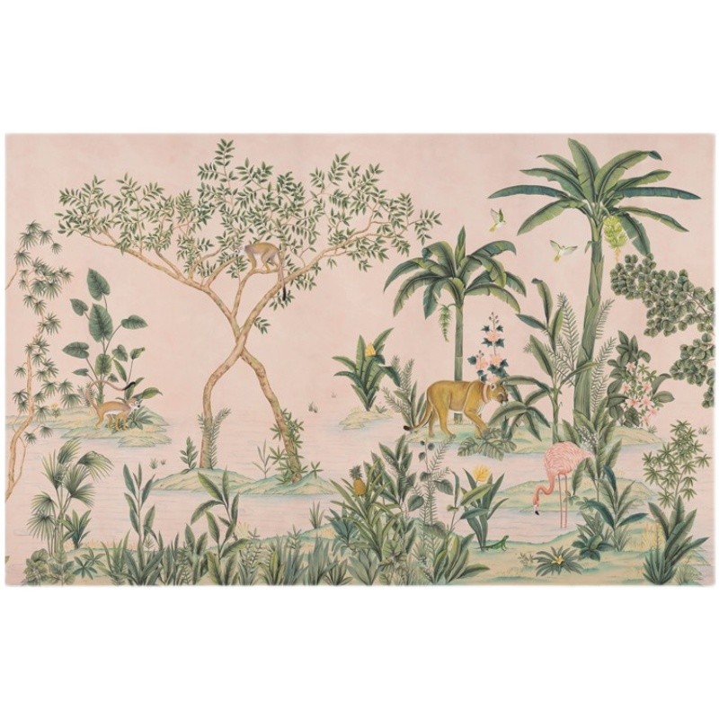 Hand-painted tropical rainforest plants animals mural wallpaper