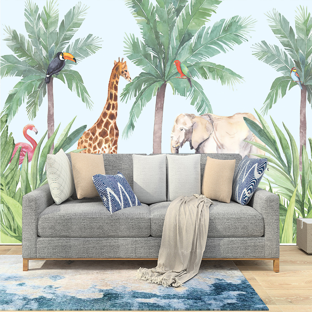 Tropical rain forest children room plant animal elephant flamingos mural wallpaper